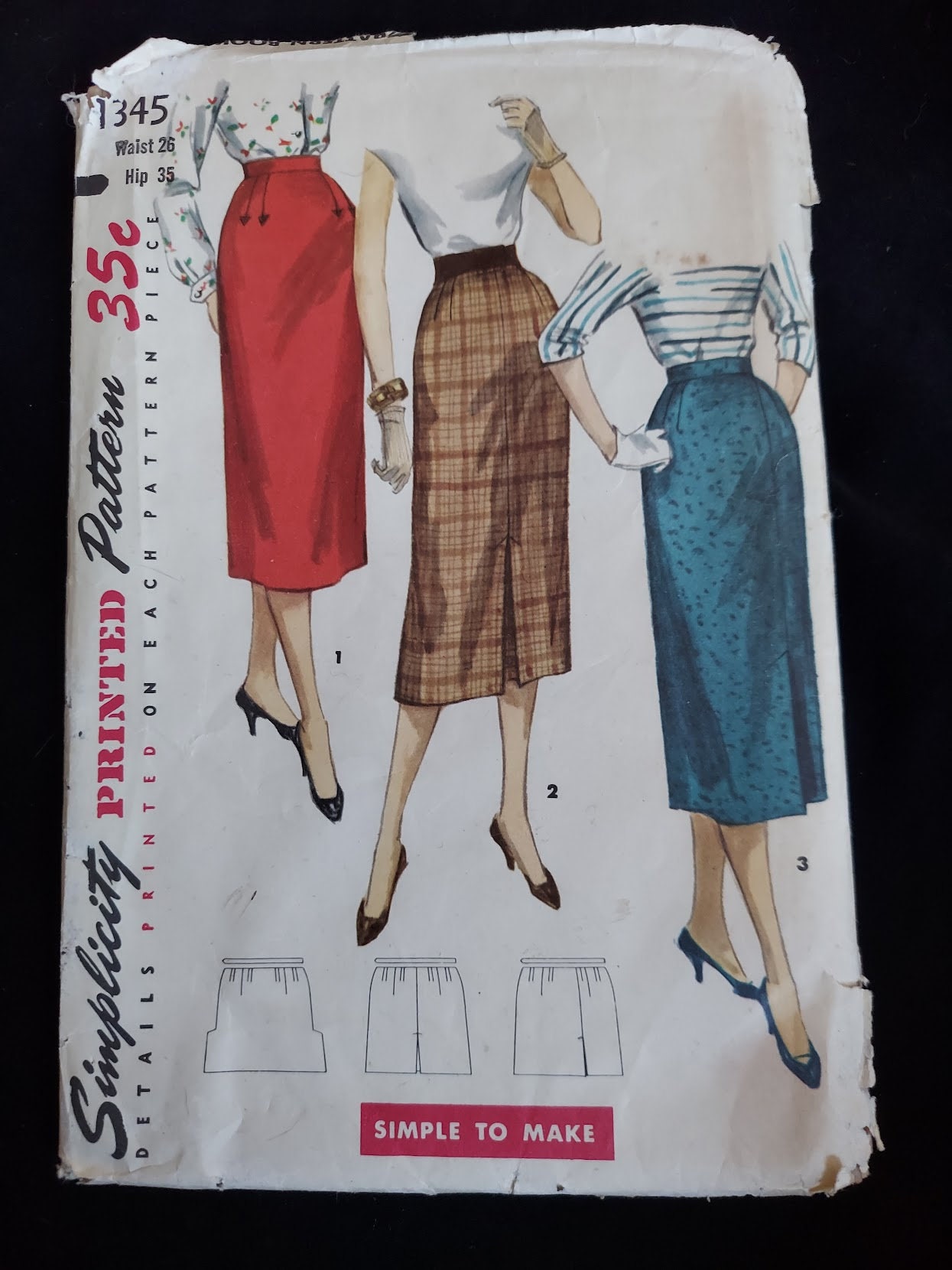 1950s One Yard Slim Skirts Pattern Simplicity 2191 Three Styles Classic 50s Wiggle Skirt Vintage Sewing Pattern