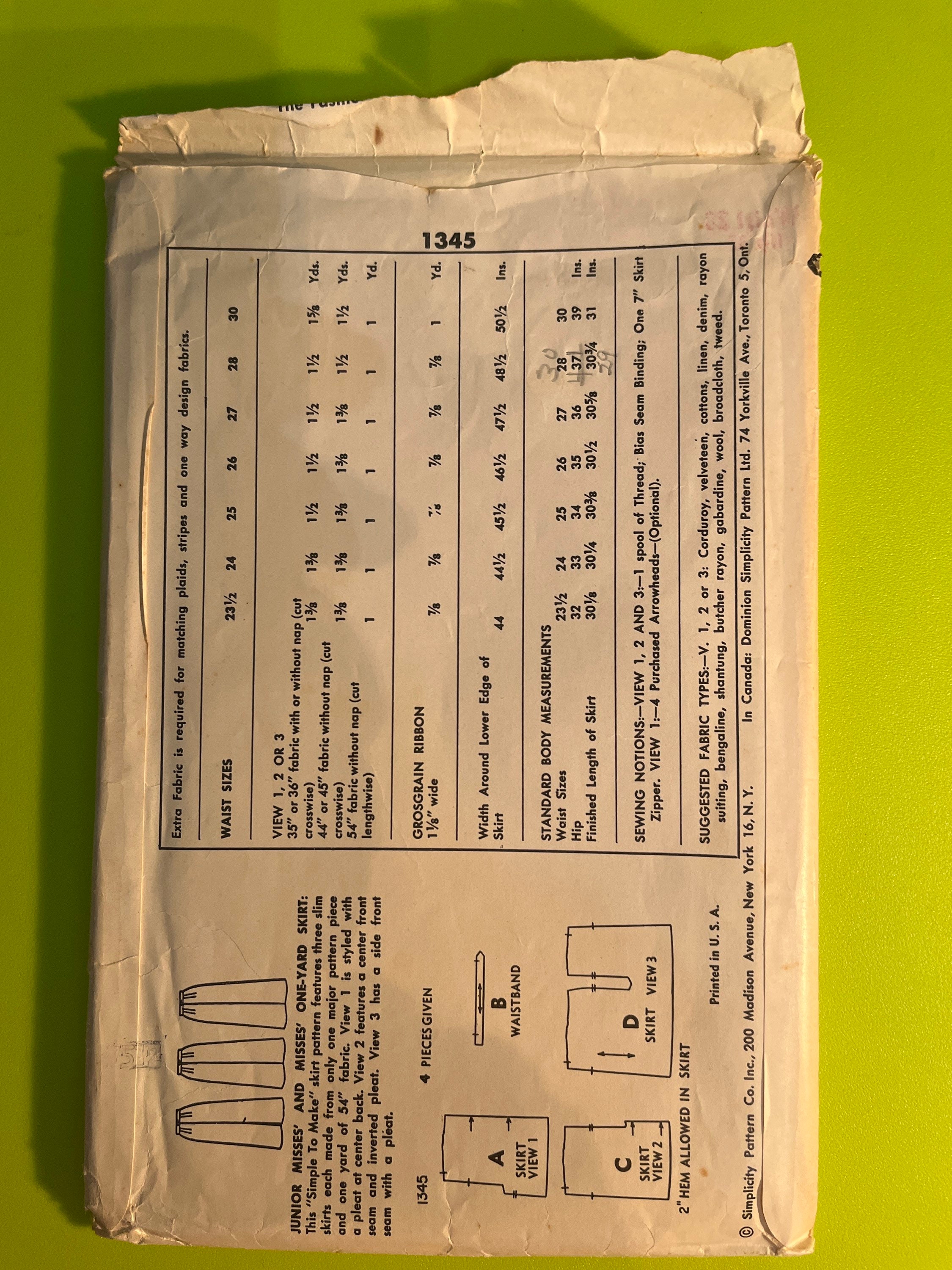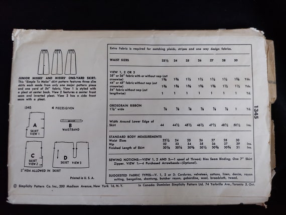 Simplicity Pattern 1345 Misses Pencil Skirt Pattern Waist Etsy